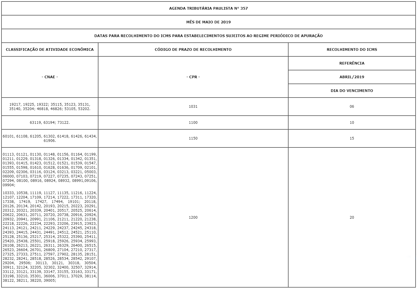 O Coordenador da Administração Tributária declara que as datas fixadas para cumprimento das OBRIGAÇÕES PRINCIPAIS E ACESSÓRIAS, do mês de MAIO de 2019, são as constantes da Agenda Tributária Paulista anexa.