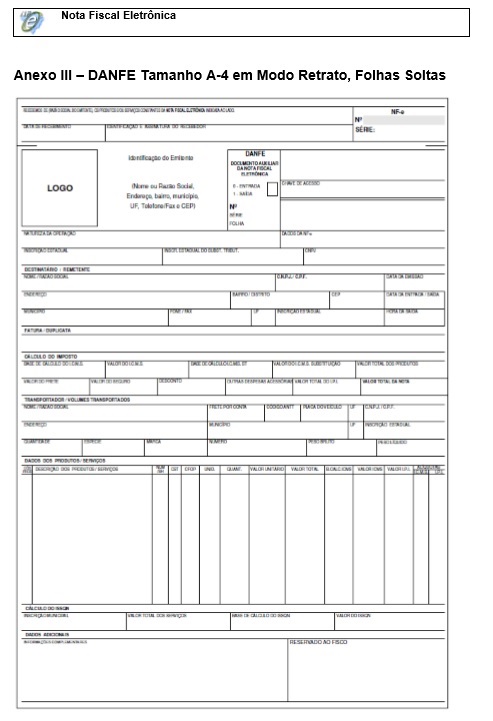 O Documento Auxiliar da Nota Fiscal Eletrônica (DANFE) é o documento que apresenta as informações essenciais da Nota Fiscal Eletrônica e é utilizado para controle fiscal da circulação de mercadorias. Veja um dos modelos utilizados: